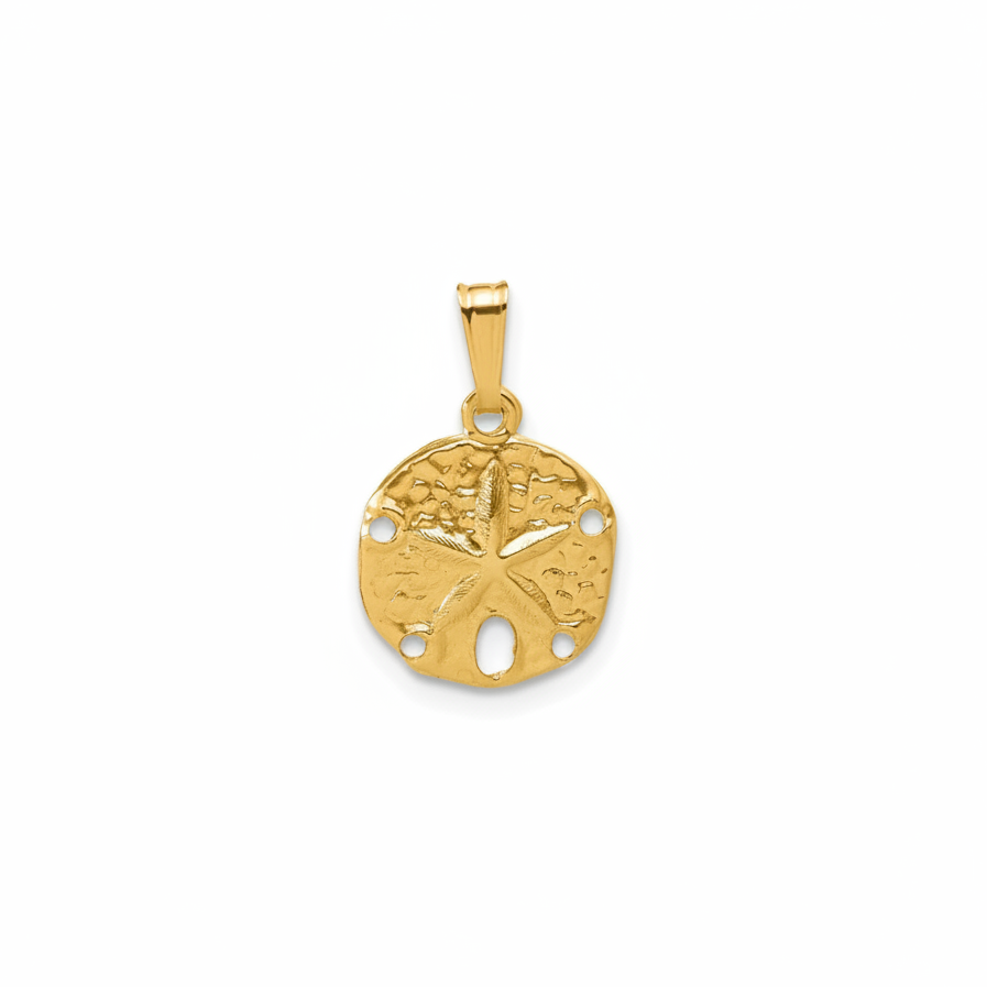 A petite gold-filled pendant featuring a textured sand dollar design. Lightweight, coastal-inspired, and perfect for everyday wear.