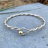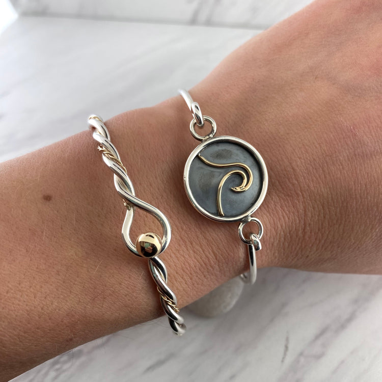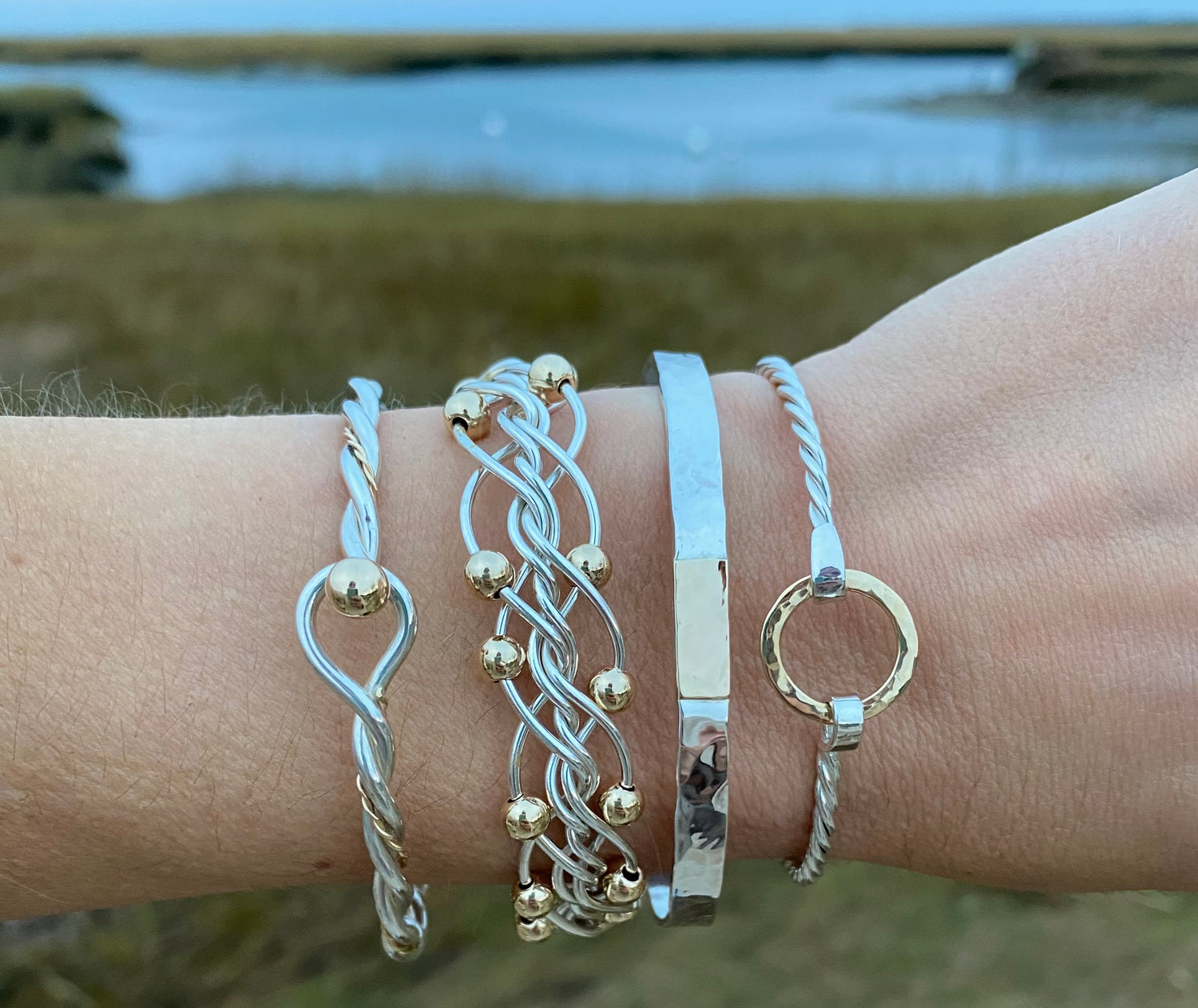 New variation of our handmade Cape Cod hook bracelets.  This version features sterling silver and 14k twisted gold wire interwoven and finished with a 14k gold ball.