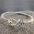 A beautiful compliment to the Cape Cod Jewelry collection! This two tone bracelet features our shepherds knot design in a new way! The sterling silver band is twisted to add more detail, with a loop hoop closure and solid 14k gold ball.
