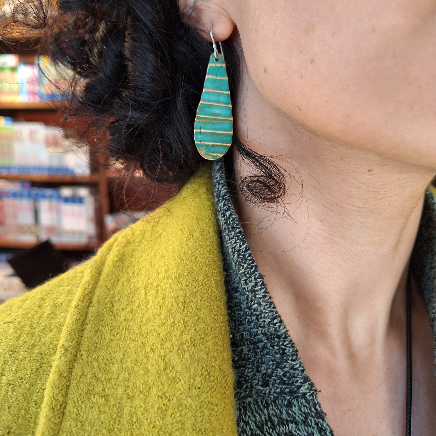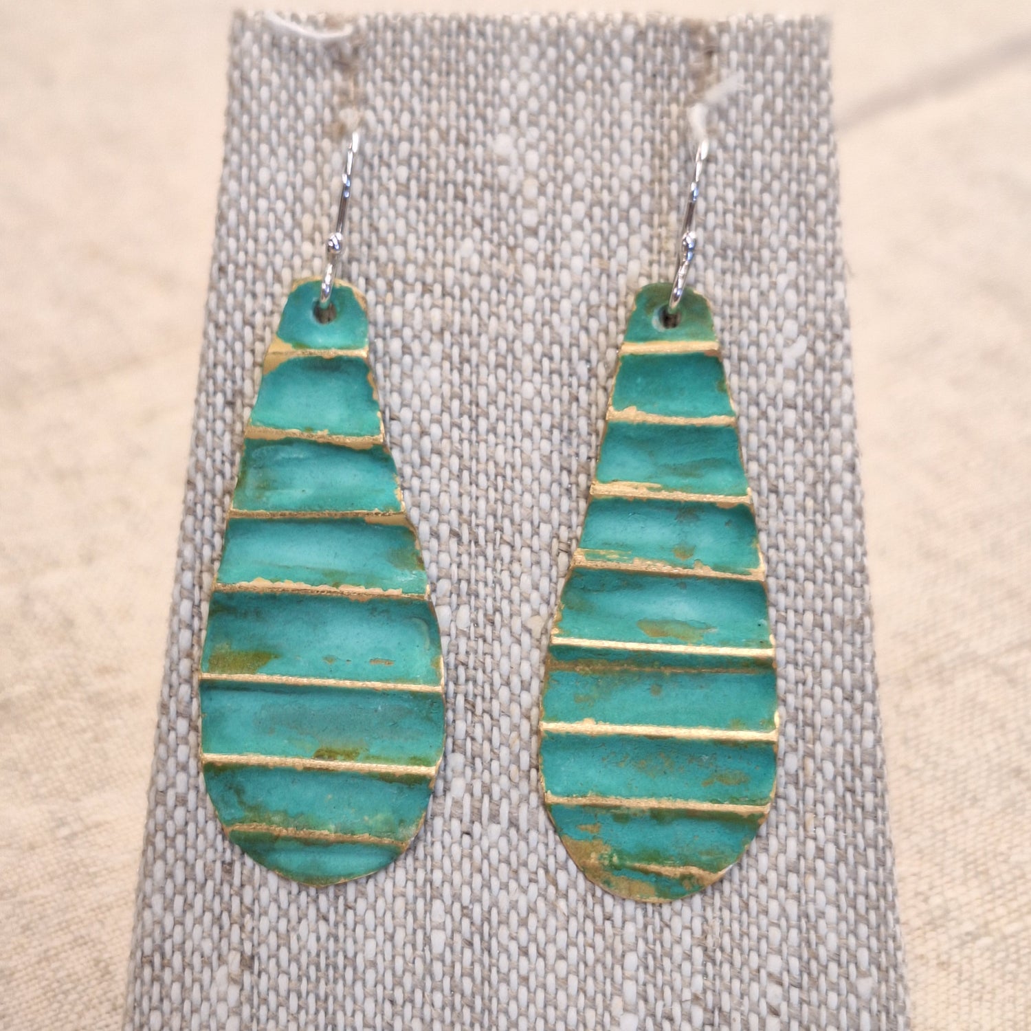 They have a gorgeous turquoise color achieved through patina on brass. Gold filled ear wires.