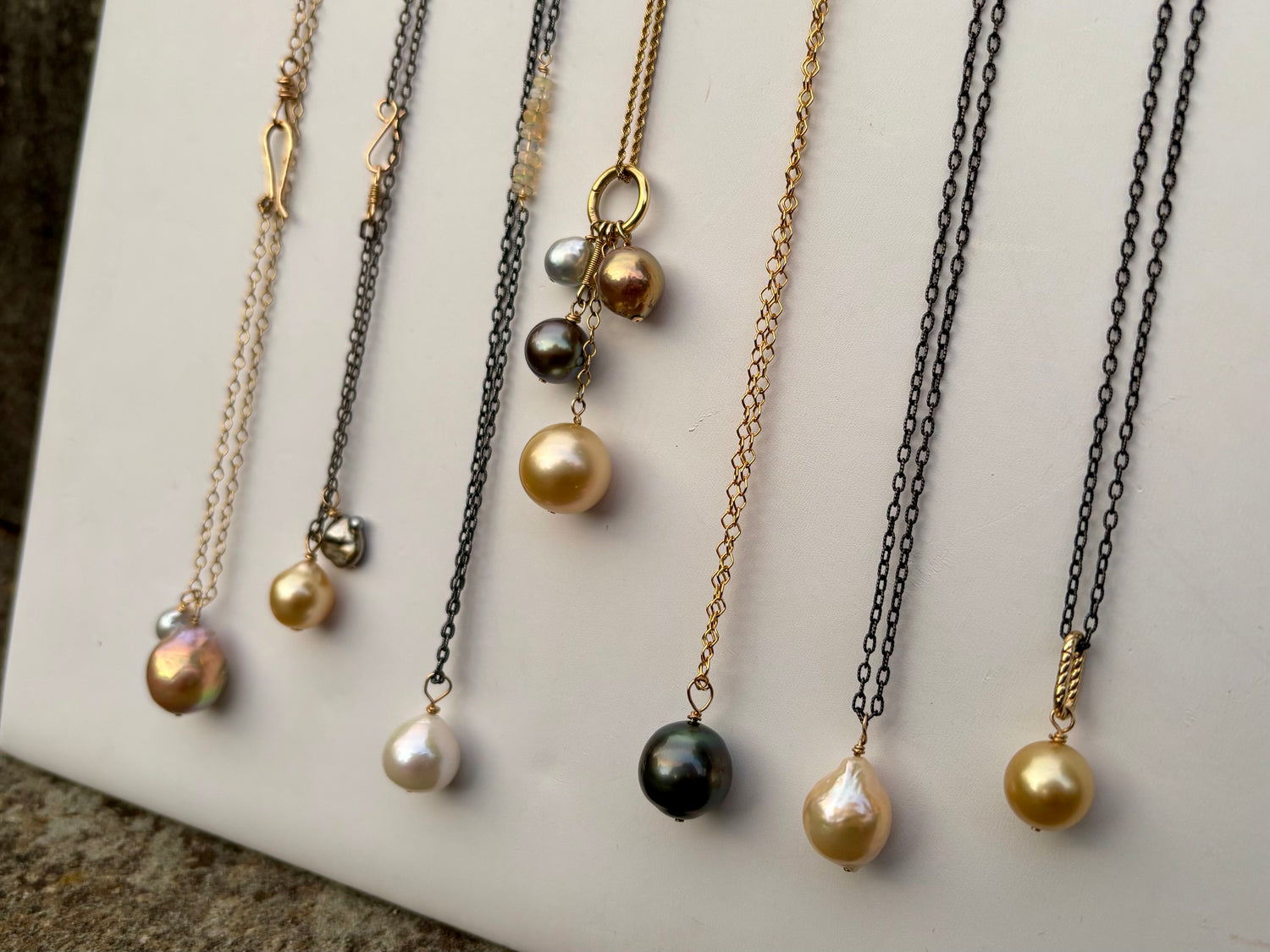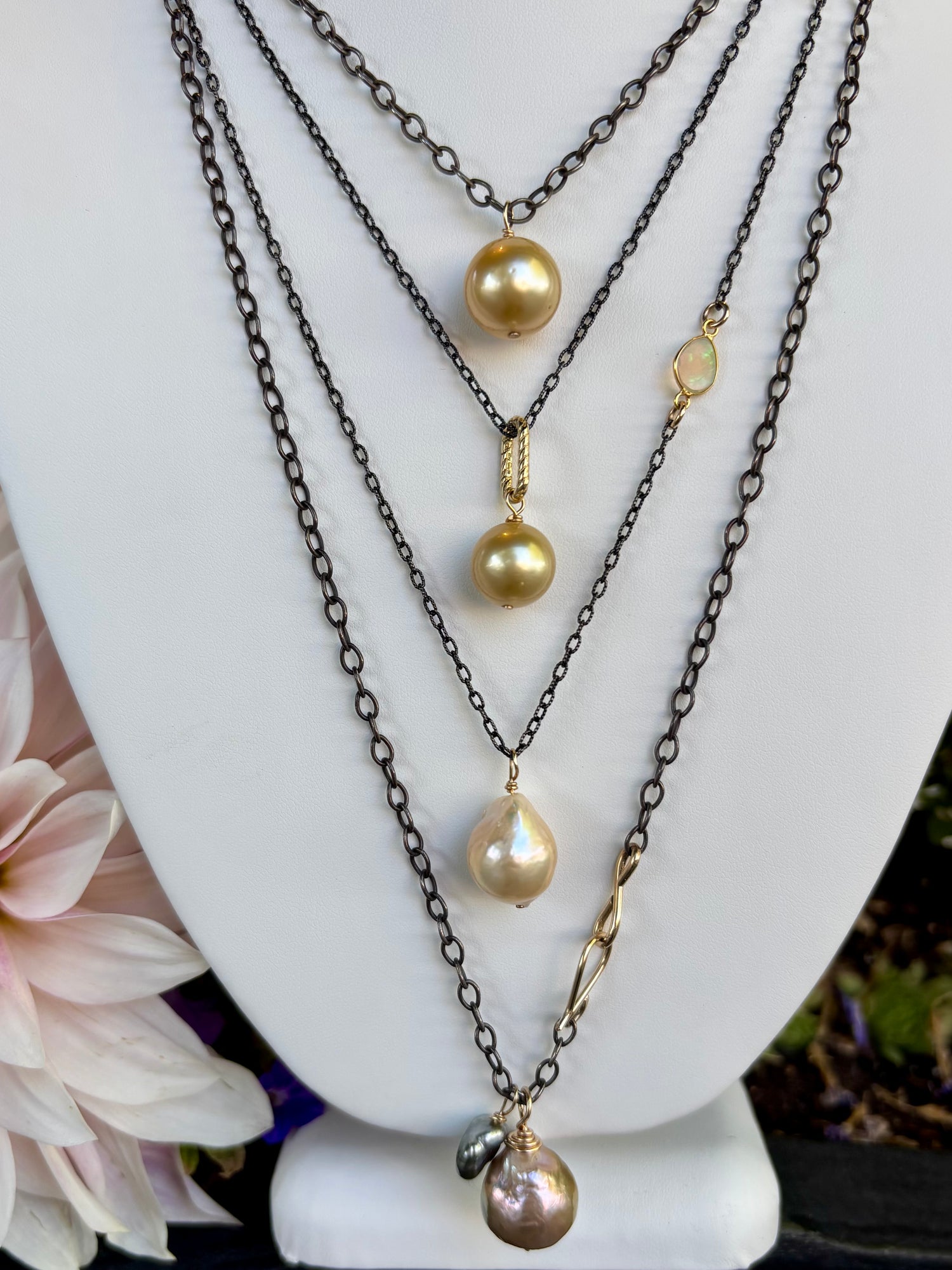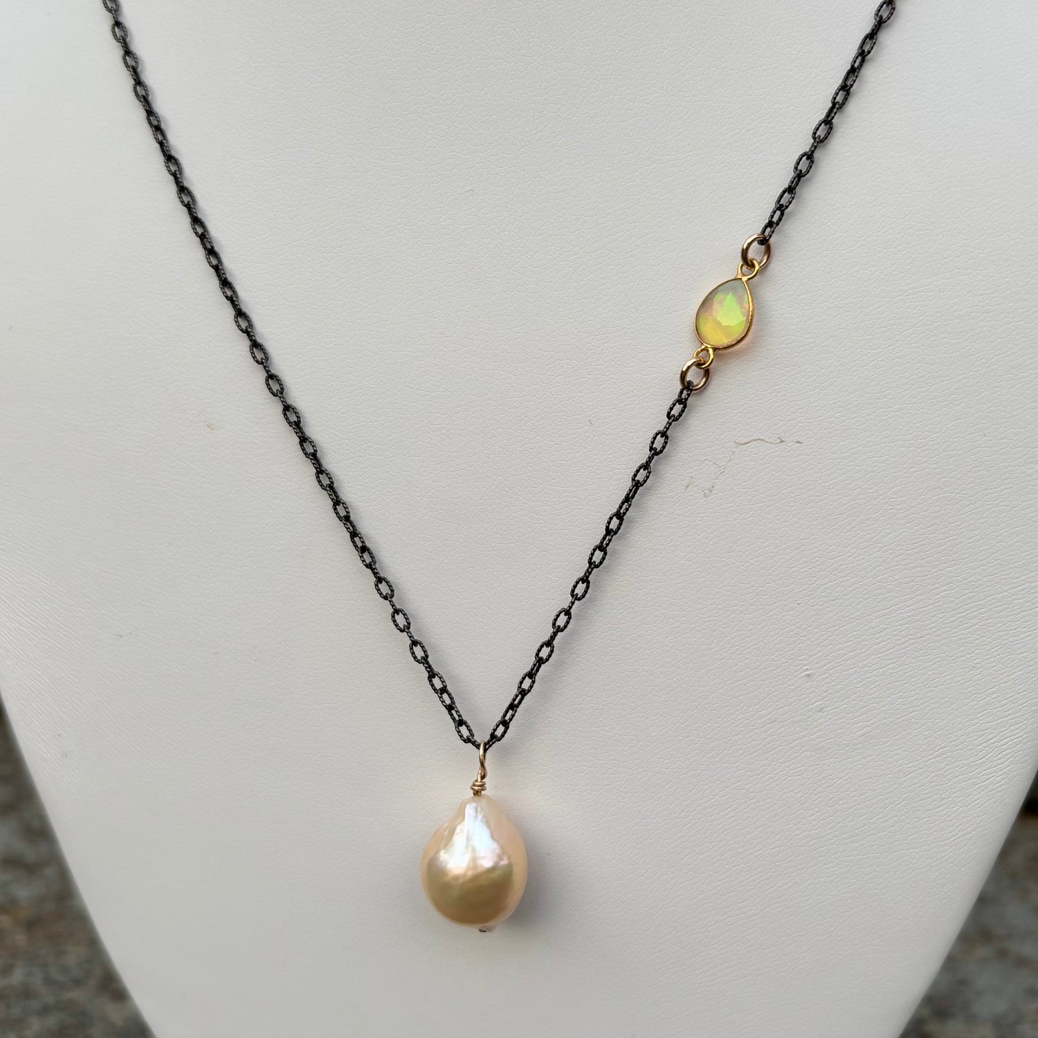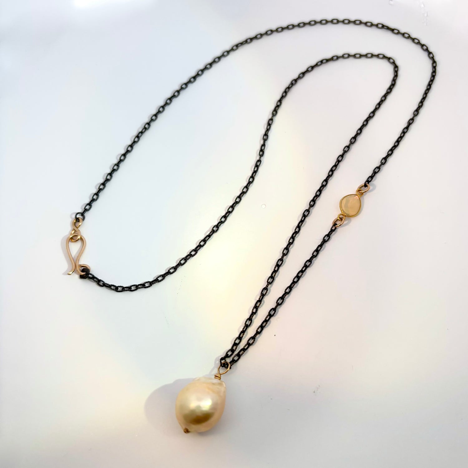 This necklace features a darkened oxidized sterling silver chain with a creamy ivory baroque pearl and a warm toned iridescent opal, bezel set in 18K gold.  Makes a great layering piece, at 24" long.  Handmade 14K gold-filled clasp.