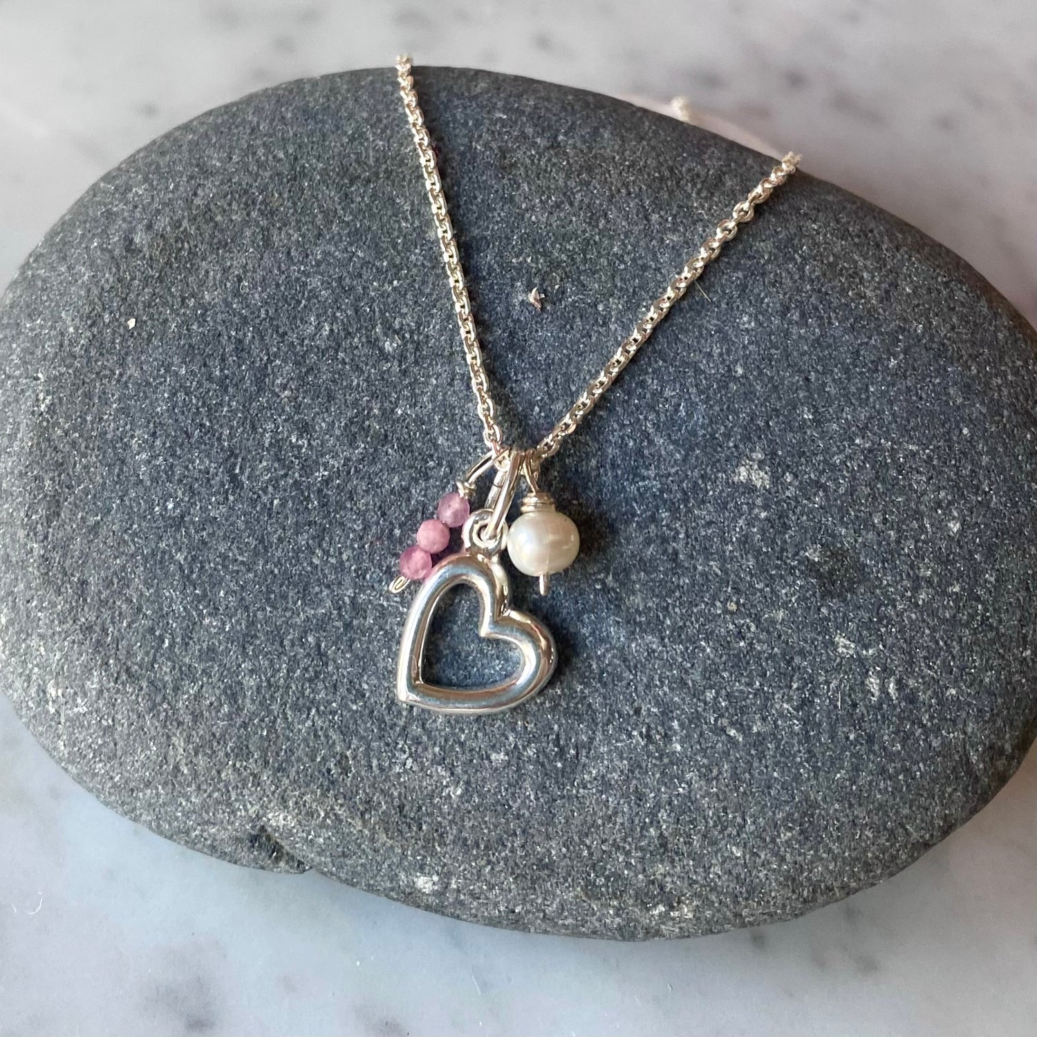Sterling silver solid open heart charm, freshwater pearl, and three tiny pink tourmaline beads combine in this sweet necklace.  Handmade on Cape Cod.