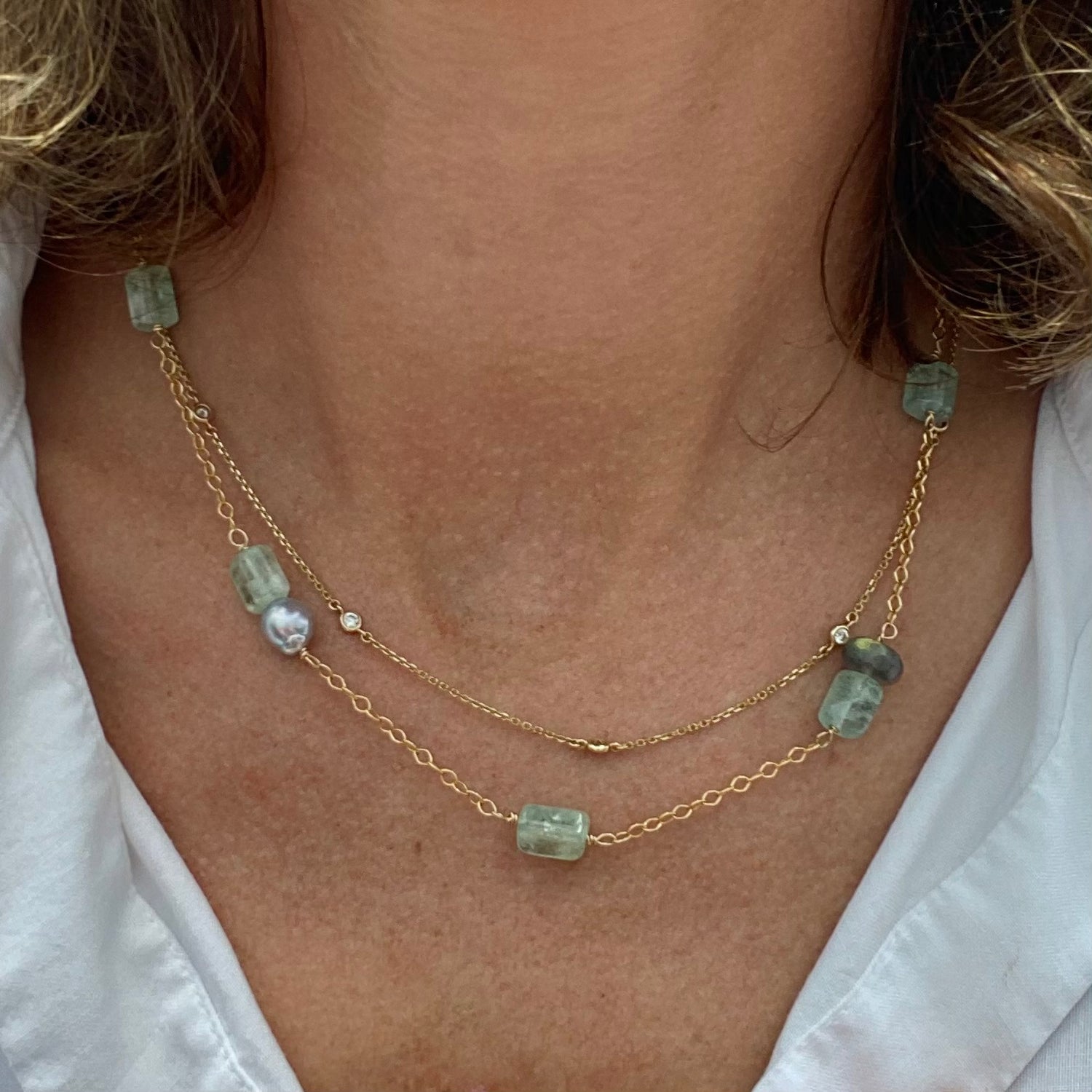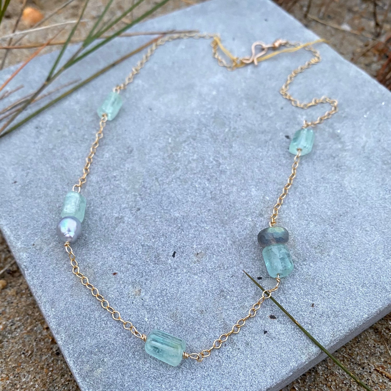 Aquamarine beads mix with gray Akoya Baroque pearls and faceted Laboradorite beads in this handmade station necklace. Great as a layer or on its own. Made with 14k gold filled cable chain and heavy handmade clasp. Approximately 18”.