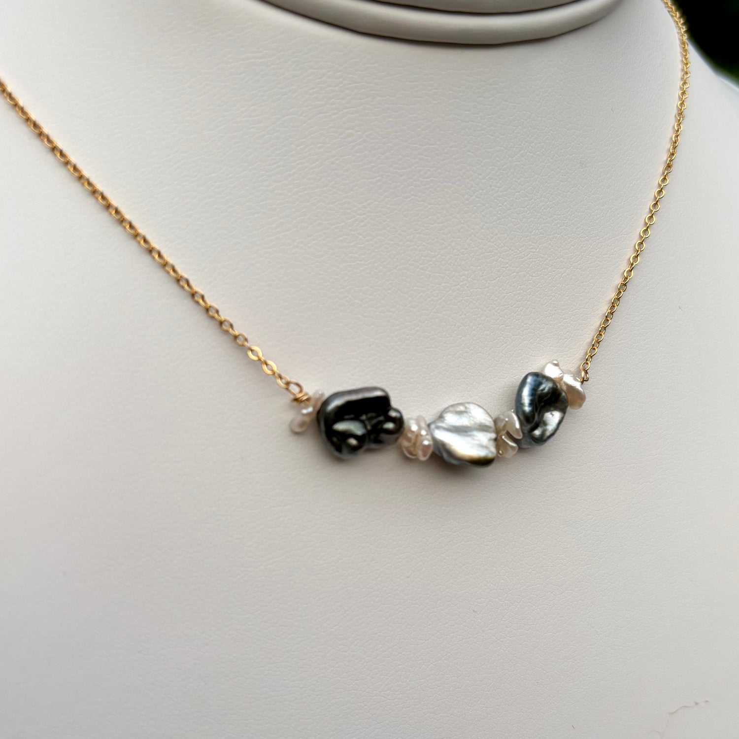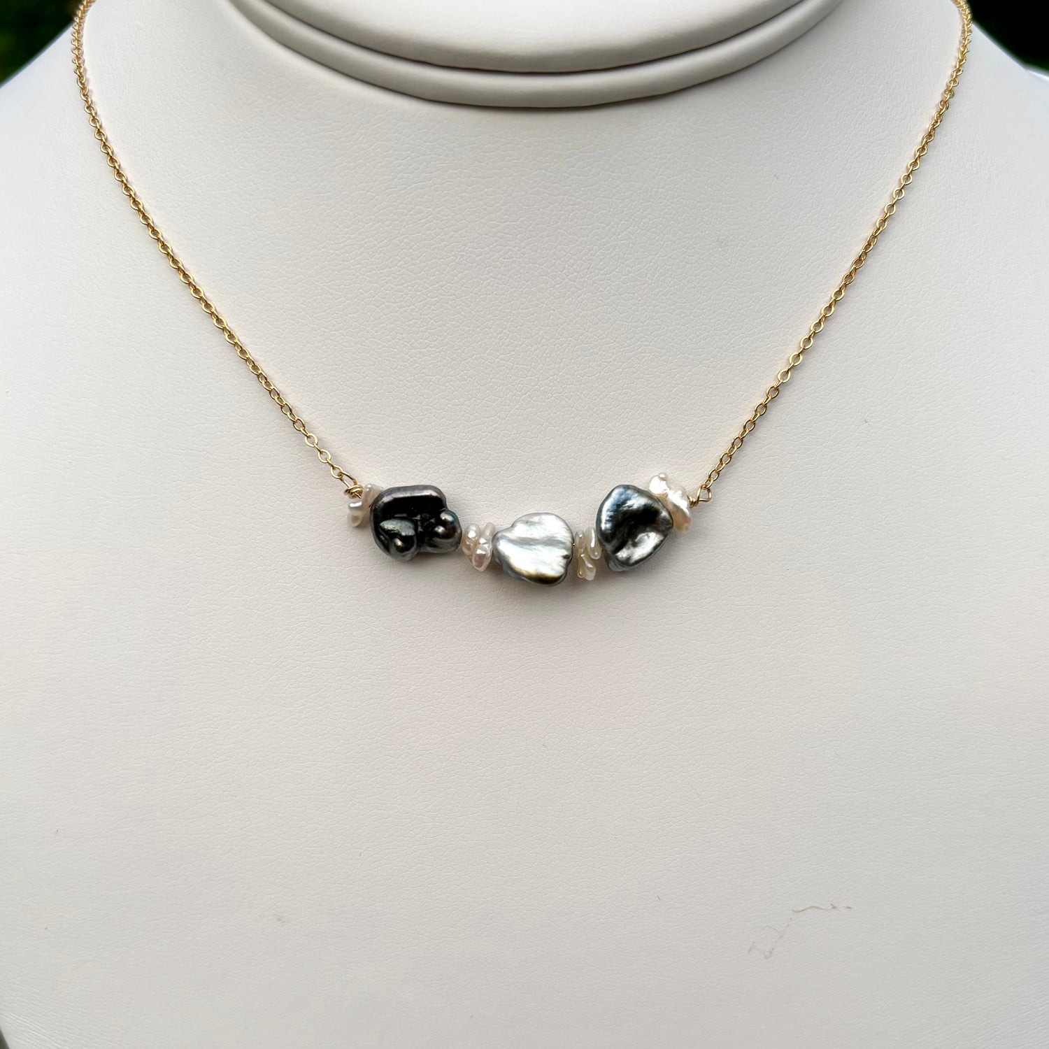This lovely necklace features three natural silver-gray Tahitian Keshi pearls, mixed with delicate, tiny cream colored Akoya Keshi pearls. They are attached to a 14K gold-filled cable chain, measureing approximately 17 inches total. Lobster claw clasp.  Handmade on Cape Cod.