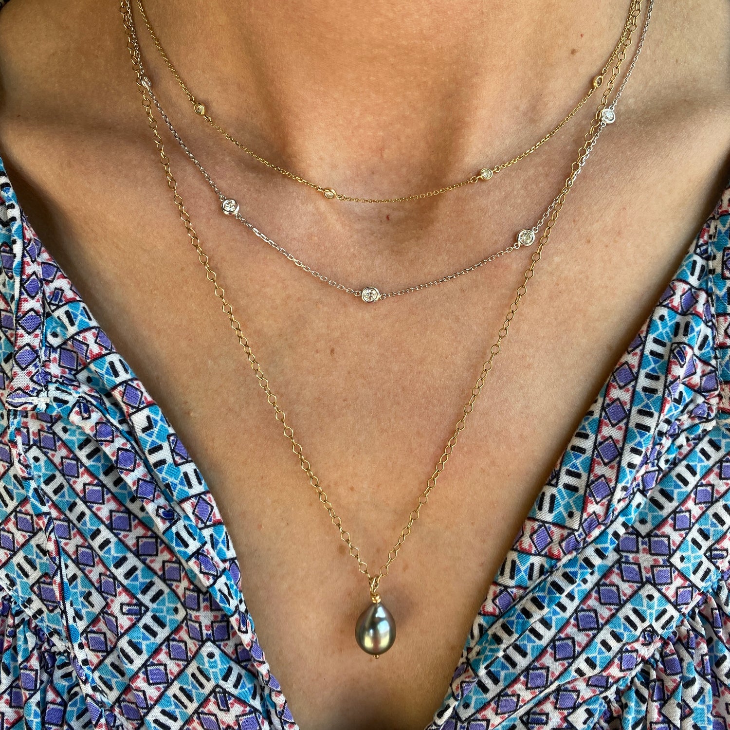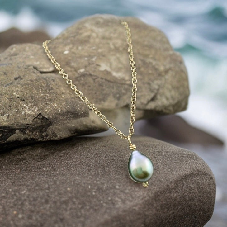 Everyday elegance is the signature of this simple and classic design.  A gorgeous natural gray Tahitian pearl in a baroque teardrop shape hangs from a long 14k gold-filled cable chain of approx. 24".  Finished with a beautiful handmade clasp that can be worn low as part of the visible necklace or at back.  Great as a layer or on its own. Handmade on Cape Cod, inspired by the ocean.