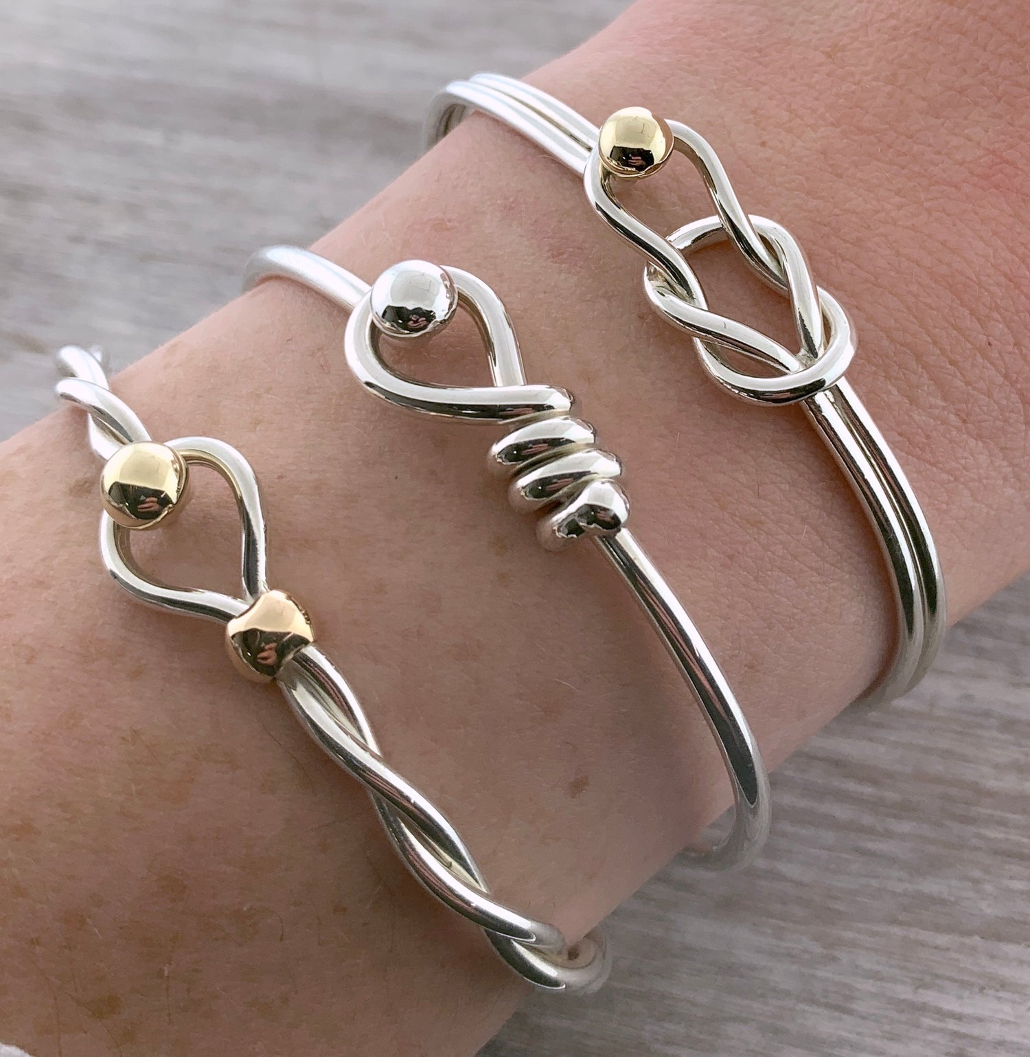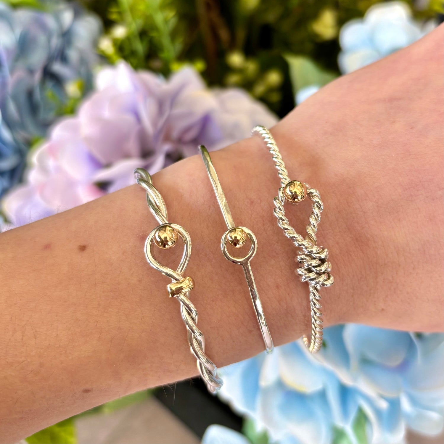 Two pieces of sterling silver are twisted and fused together to create the twisted sandbar bracelet. The band hooks onto a solid 14k gold ball and a solid 14k gold wrap on the side beautifully finishes the bracelet.