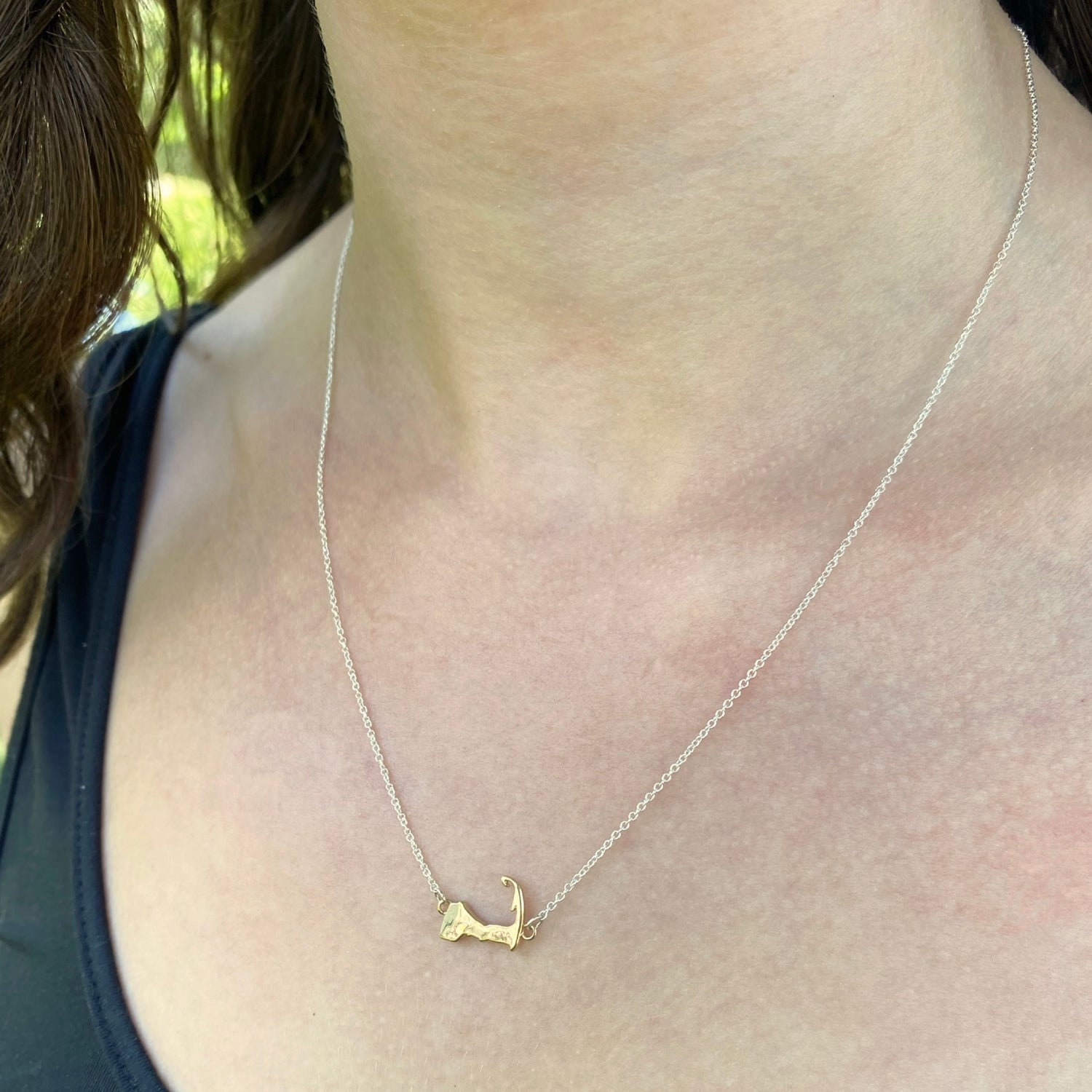 Now available exclusively at Cape Cod Jewelers in solid 14k yellow gold! The two tone option features a sterling silver chain with a solid 14k gold (yellow or rose) CC map. Also available in all sterling silver.