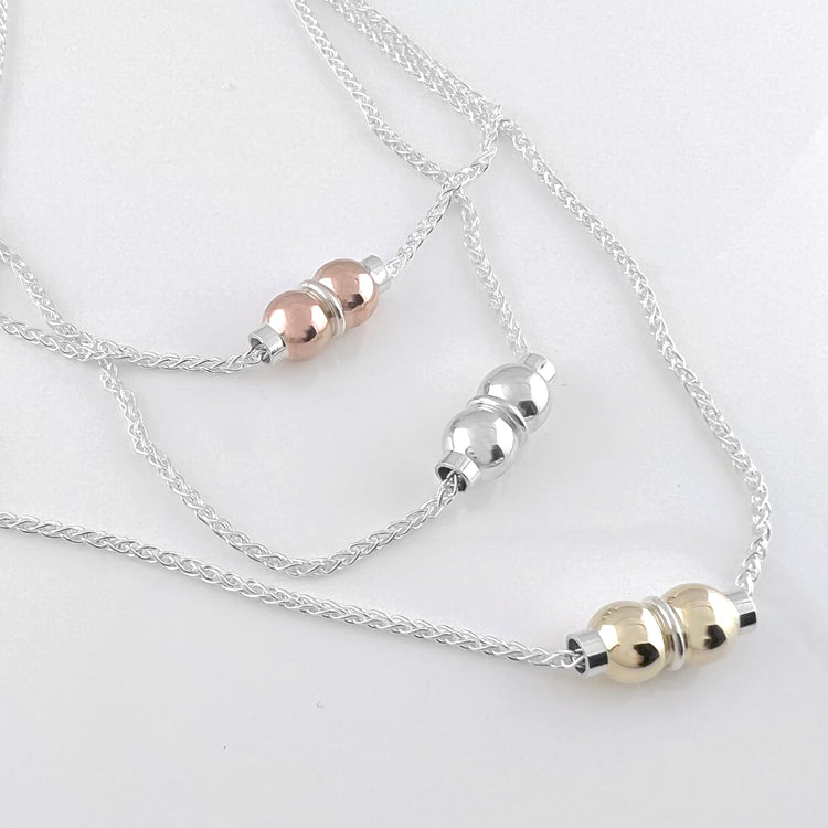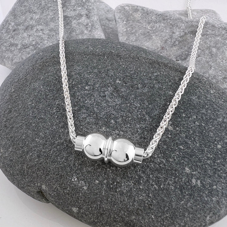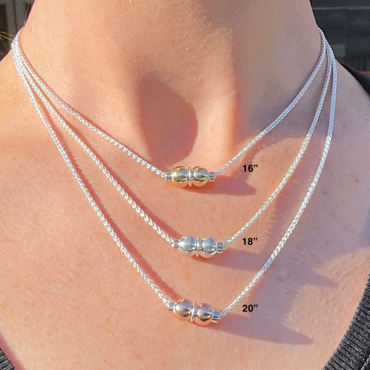 This necklace is the perfect compliment to any bracelet in the Cape Cod Jewelry line especially fans of the twisted style bracelets! It can be paired with the single or triple ball necklaces for a layered look. It features two Cape Cod balls fused together, which slides smoothly on a wheat chain.