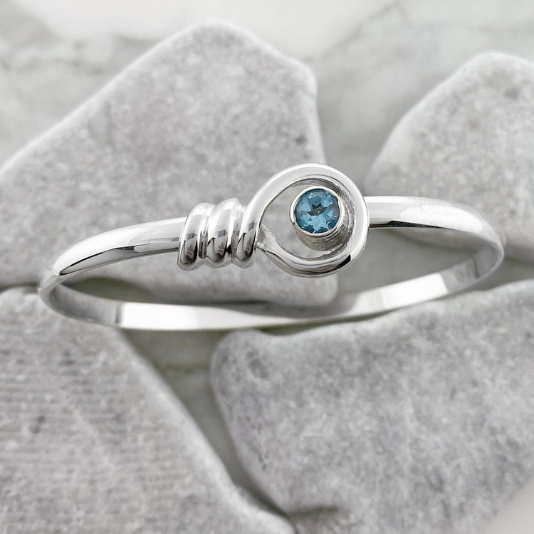 This Sterling Silver hook bracelet features a stunning Blue Topaz gemstone set in the classic Shepherd's Knot. Blue Topaz is the birthstone for the month of November (& takes place of Blue Zircon for December's birthstone).
