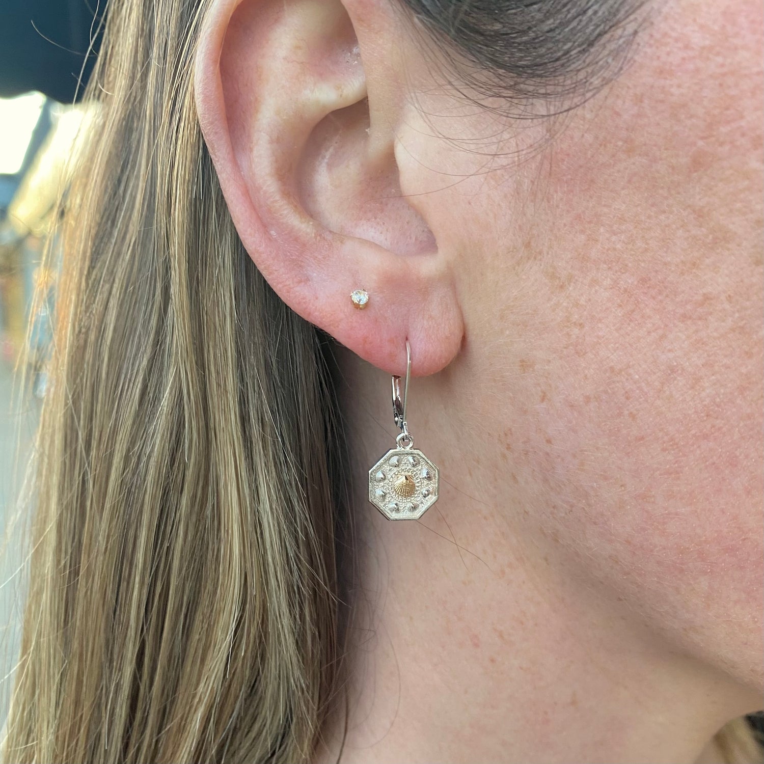 These sterling silver sailor's valentine's earrings feature a 14k gold scallop shell centerpiece.