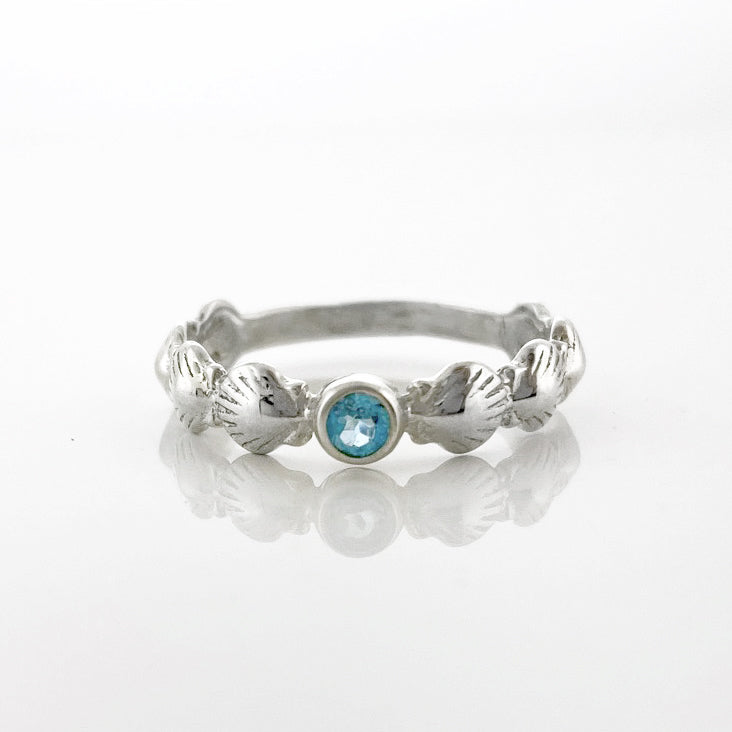 A slim fit band is perfect for the ocean lover! This Sterling Silver band features tiny scallops almost all the way around, for a delicate touch of the sea on your finger. Beautiful blue topaz featured in the center.