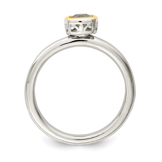 This sterling silver ring features a beautifully cut aquamarine bezel set and surrounded by a layer of 14k gold.