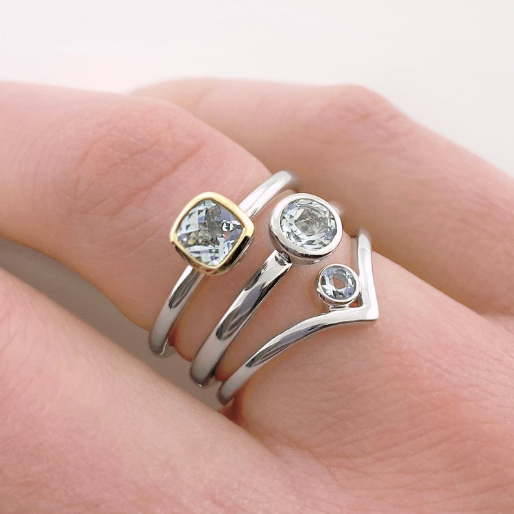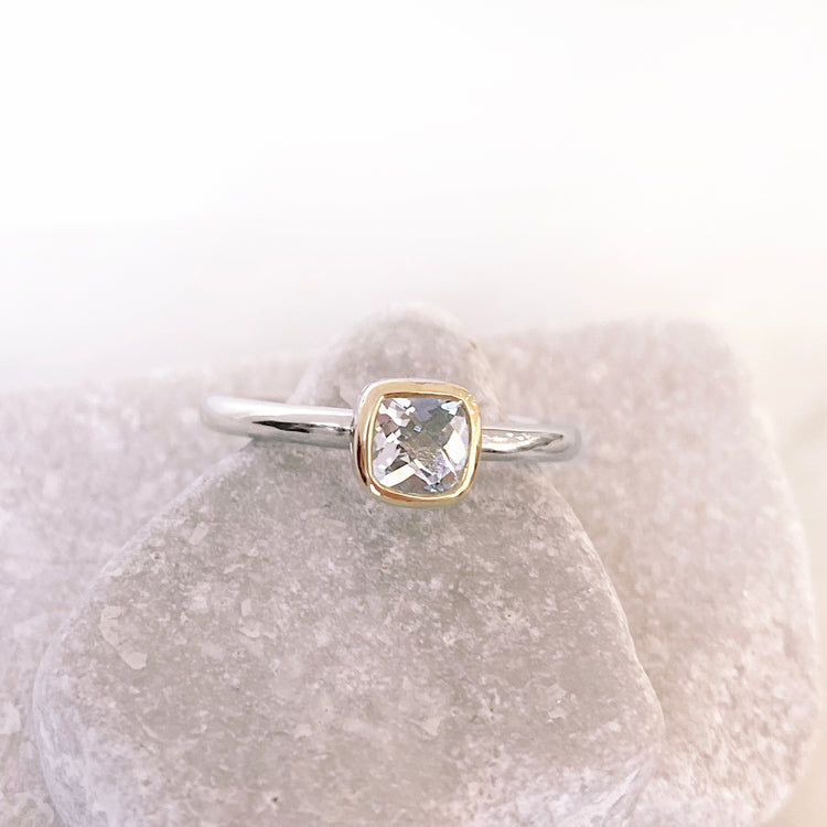The mix of two tone metals allows this ring to compliment other Cape Cod Jewelry and pairs pairs perfectly with our Two Tone Aquamarine Stud Earrings or Two Tone Aquamarine Necklace