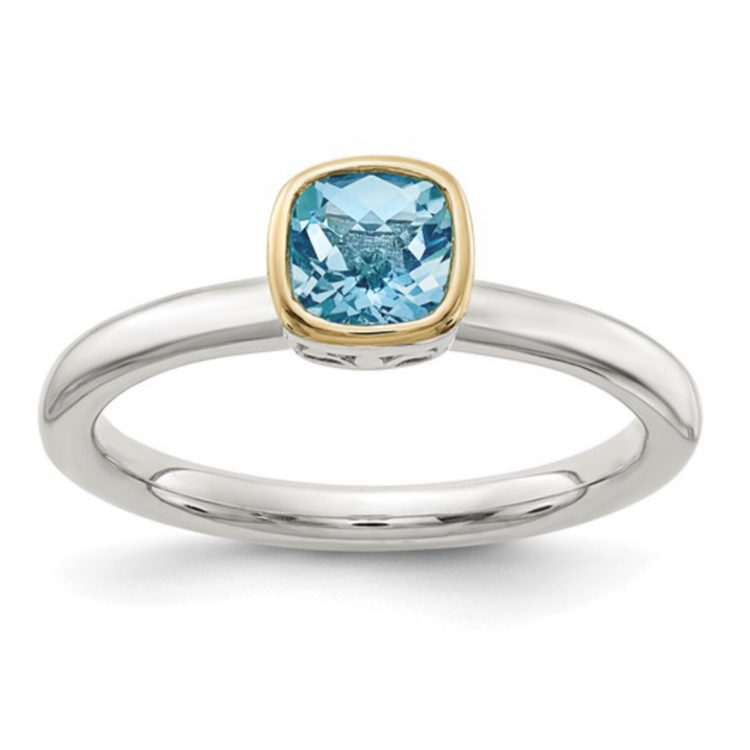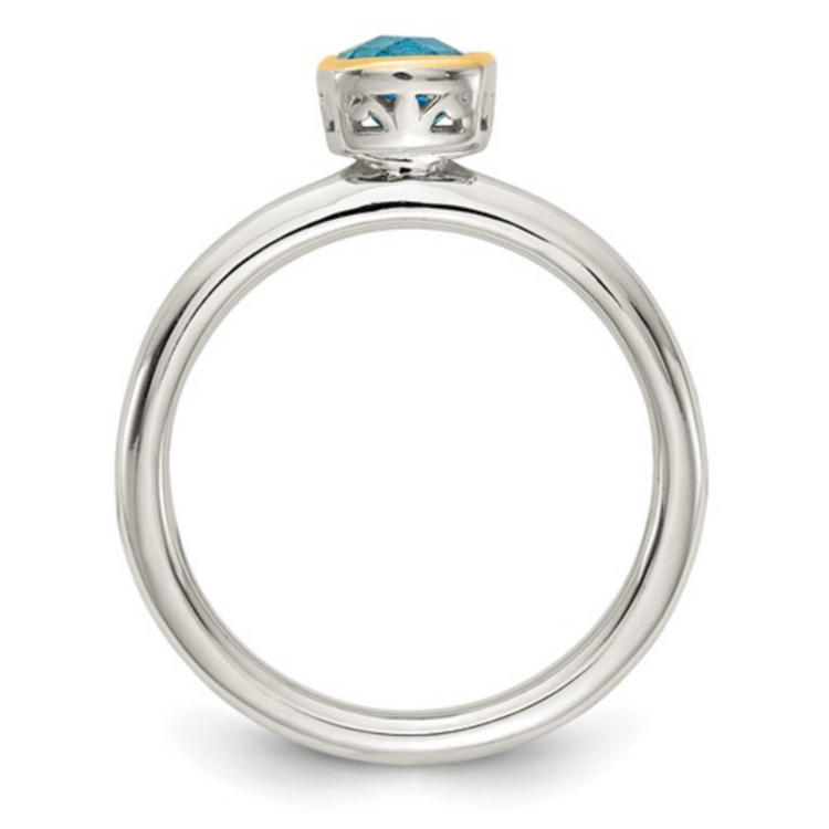 This sterling silver ring features a beautifully cut blue topaz bezel set and surrounded by a layer of 14k gold.