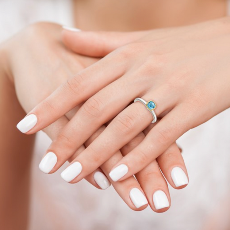 The mix of two tone metals allows this ring to compliment other Cape Cod Jewelry and pairs pairs perfectly with our Two Tone Blue Topaz Stud Earrings or Two Tone Blue Topaz Necklace