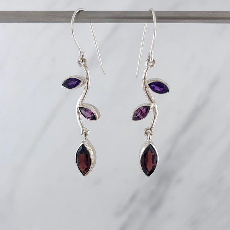 Designed by Misti Martin, these sterling silver earrings feature amethyst and garnet stones in marquise shapes. These earrings have beautiful curves and evoke nature in every way.