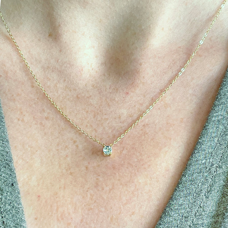 This 14k gold necklace features a beautiful petite aquamarine in a minimalist four prong setting.