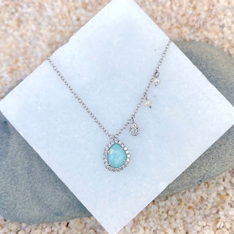 14K white gold necklace featuring a pale, milky aquamarine stone surrounded by petite diamonds.  Delicate cable chain is asymmetrically accented with a diamond drop and two petite freshwater pearls. Approximately 17" long. Designed by Meira T.