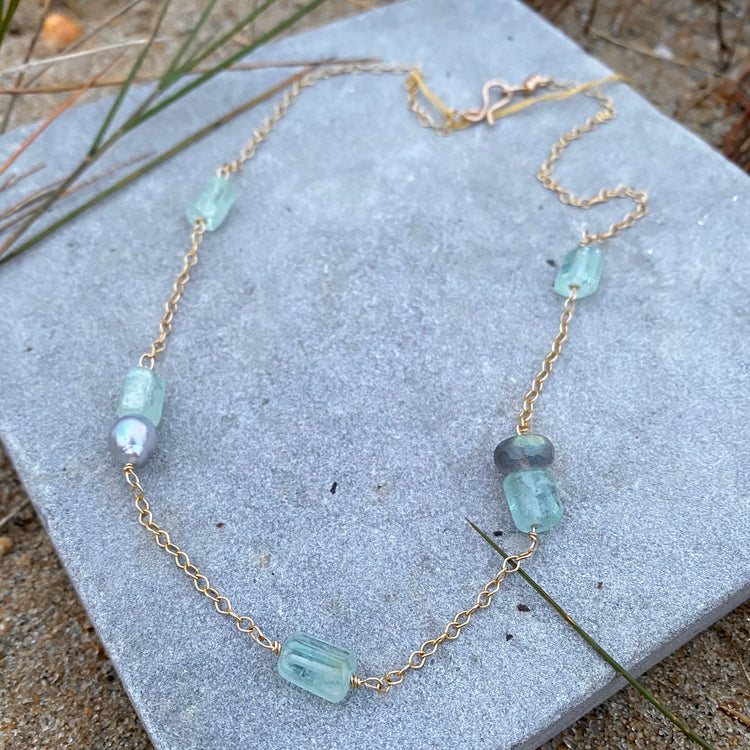 Aquamarine beads mix with gray Akoya Baroque pearls and faceted Laboradorite beads in this handmade station necklace. Great as a layer or on its own. Made with 14k gold filled cable chain and heavy handmade clasp. Approximately 18”.