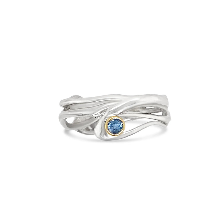 Inspired by the breezy beach sea grass, this organic ring is a perfect everyday piece. This sterling silver ring has 2.5mm blue aquamarine bezel set in 14k yellow gold.