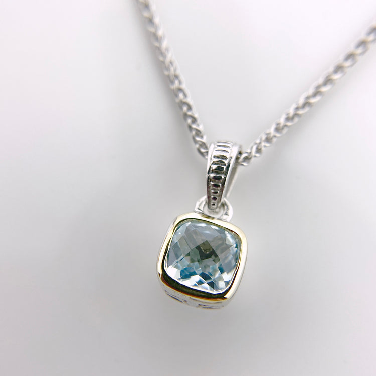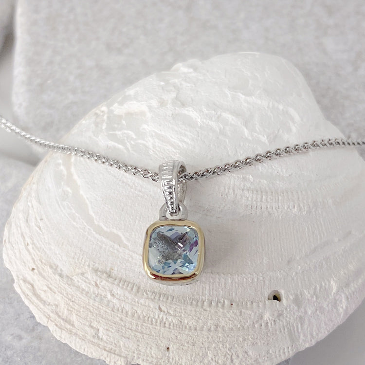 This simplistic sterling silver necklace features a cushion cut aquamarine bezel set and surrounded by a layer of 14k gold.