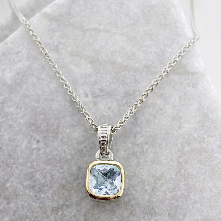This Sterling Silver necklace features a cushion cut Aquamarine gemstone bezel set and surrounded by a forward facing layer of 14K Gold.