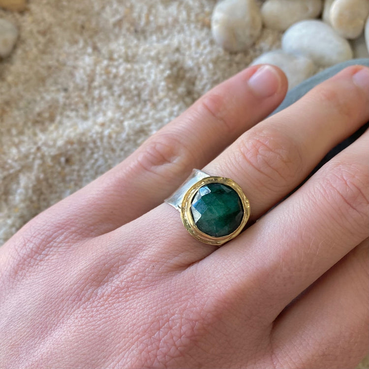 This standout ring features a beautiful faceted opaque emerald set in 9k yellow gold on a wide sterling silver band.