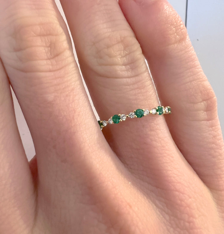 This sparkling ring features emeralds and diamonds set in a 14k yellow gold band. The constellation-like clusters of gemstones create a beautiful ring to be worn alone or stacked with your favorite pieces!