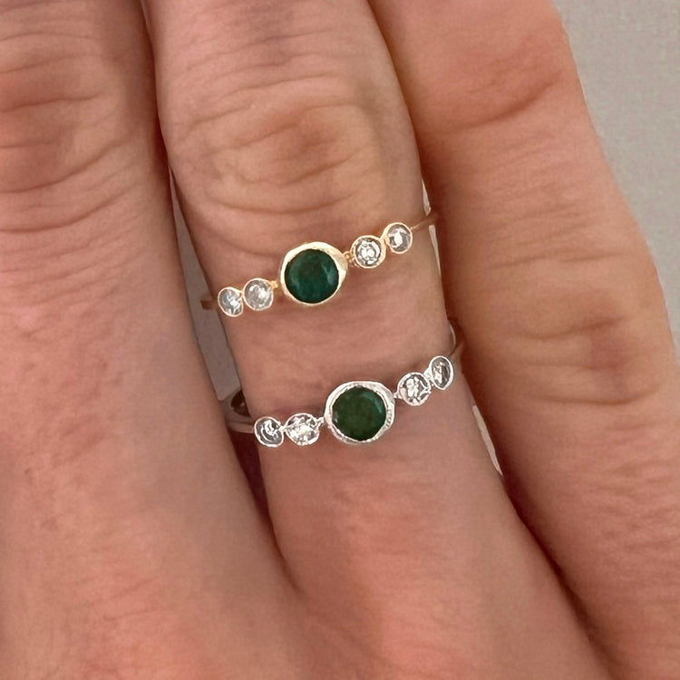 This petite ring is crafted in 14k yellow or white gold and features four round diamonds and a central emerald all set in a beaded bezel style. Great for stacking or wearing alone!