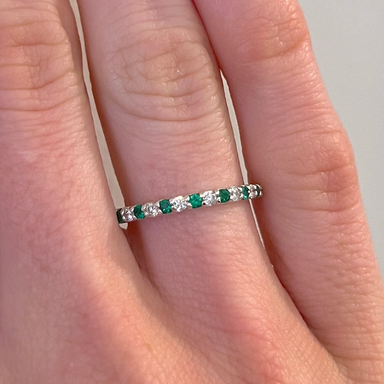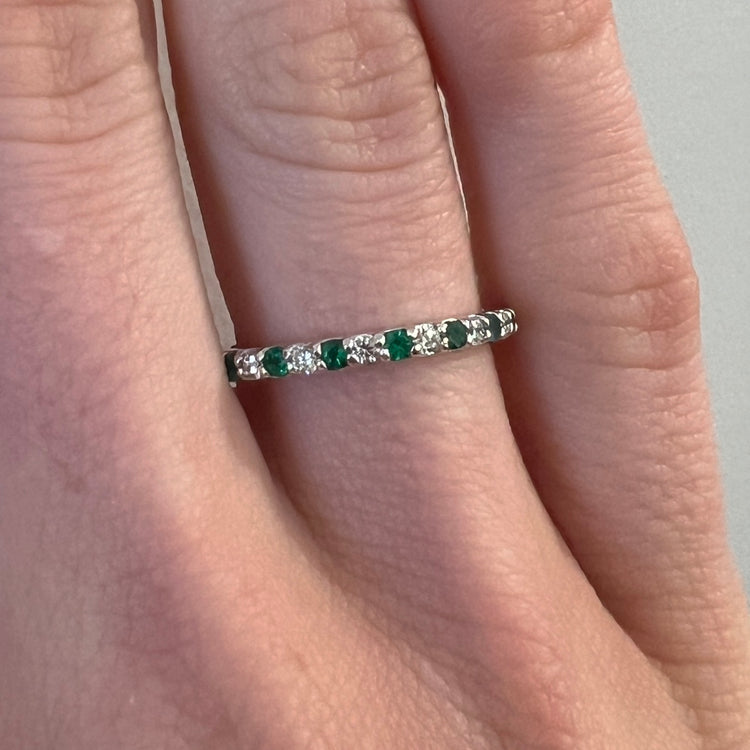 This sparkling ring features alternating emeralds and diamonds set in a 14k white gold band.