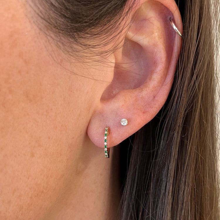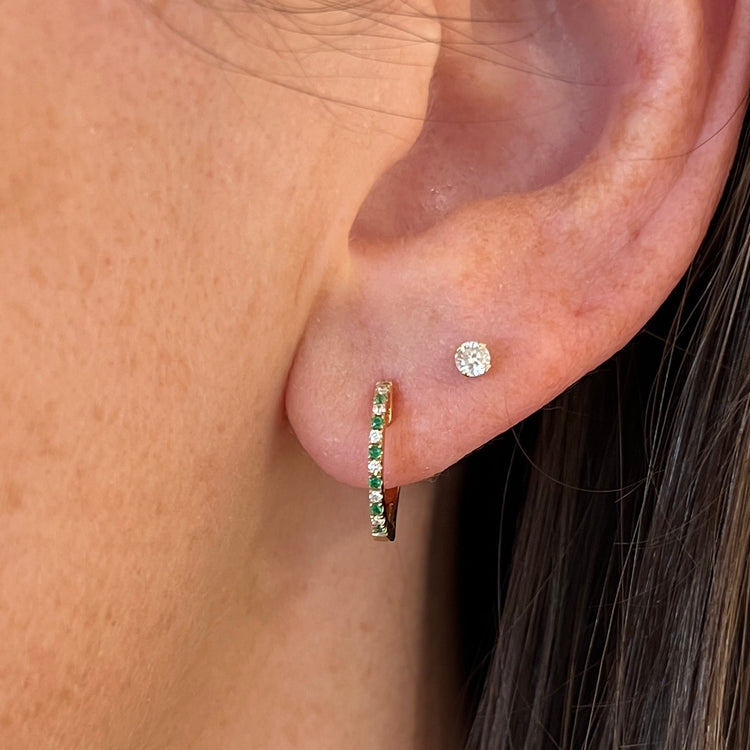 These gorgeous huggie hoops feature diamonds and emeralds for a brilliant earring to wear casually or dressed up.
