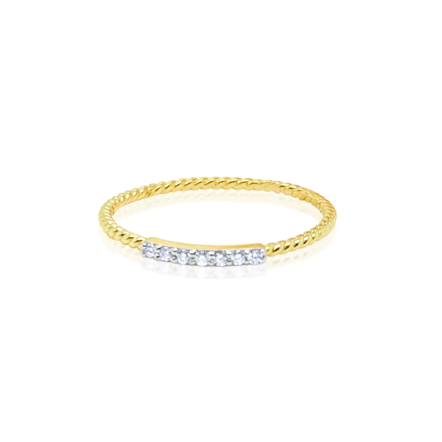 This gold ring has a a beaded style band with a center gold bar embedded with sparkling petite diamonds. A must have dainty style for ring stacking or to wear alone.