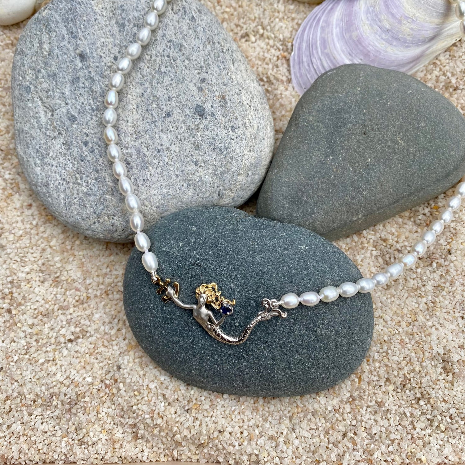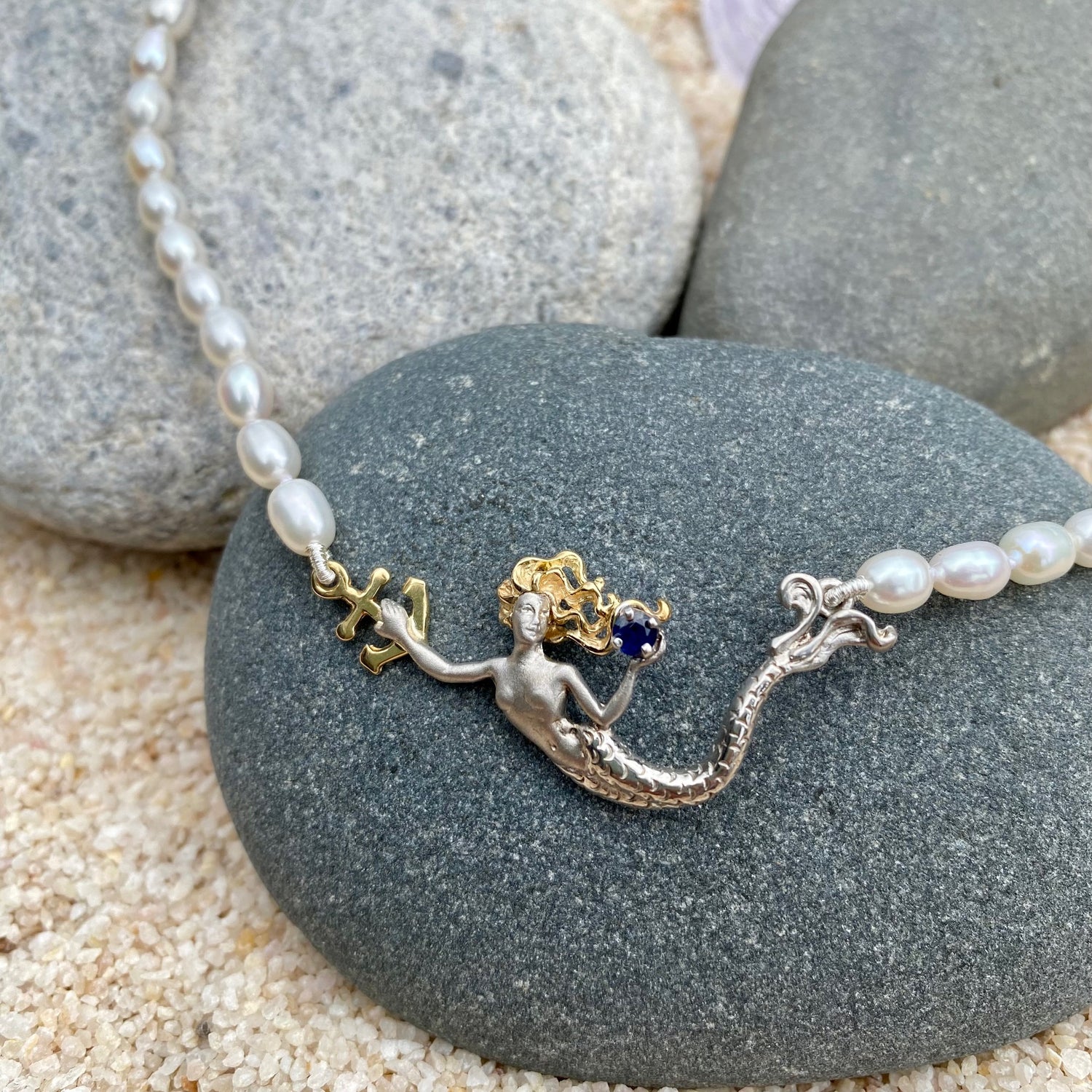Inspired by the whimsical ocean, this hand crafted, necklace features a sterling silver mermaid with solid 14k gold hair. She is holding sapphire in one hand while the other holds a 14k gold anchor. The piece comes on a 17" freshwater pearl necklace.