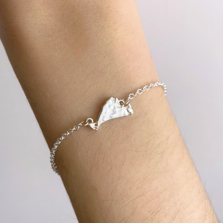 Capeology's Martha's Vineyard Map Bracelet lets you wear this special place wherever you go. This piece is made out of sterling silver. The chain is adjustable and has the option to be worn at 7.0, 7.5, or 8.0 inches in length. The back of the bracelet is engraved with "CAPEOLOGY."