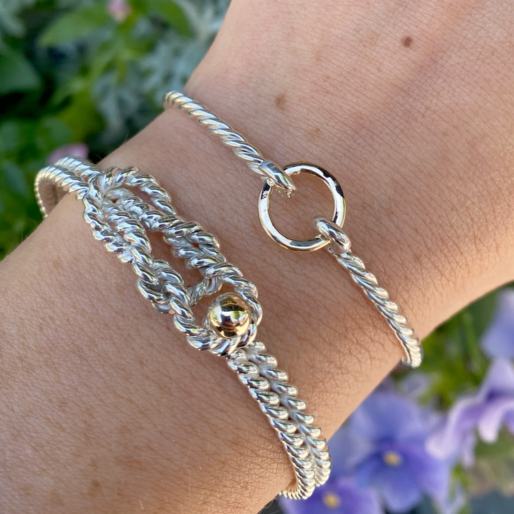 A new twist on our classic Fisherman's Knot bracelet! This bracelet features two hand twisted pieces of sterling silver, woven into a knot and hooking around a solid 14k gold ball.