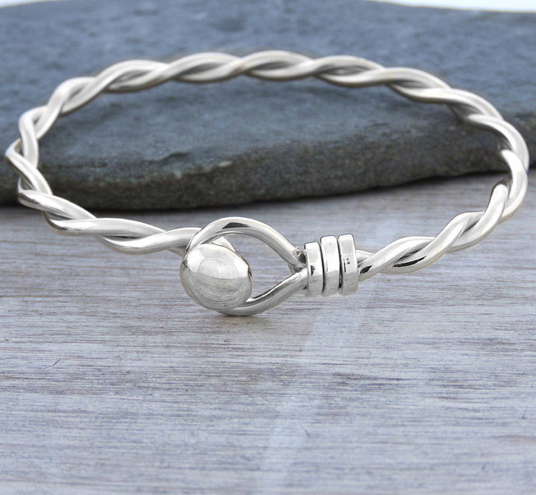 Two pieces of sterling silver are twisted and fused together to create the twisted sandbar bracelet. The band hooks onto a solid 14k gold ball and a solid 14k gold wrap on the side beautifully finishes the bracelet.