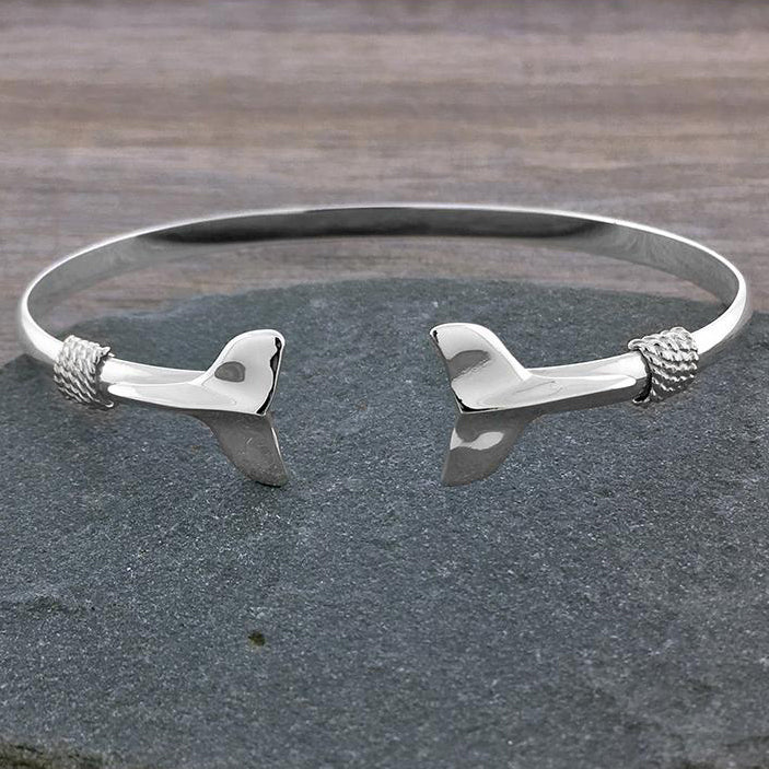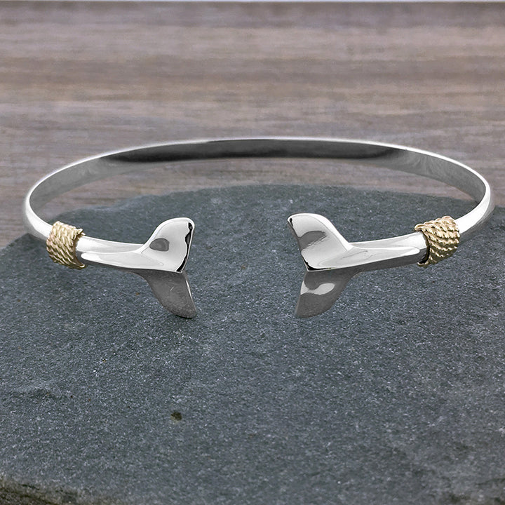 This sterling silver whale tail cuff features nautical rope wrap on each side - choose from 14k gold nautical rope or all sterling silver.