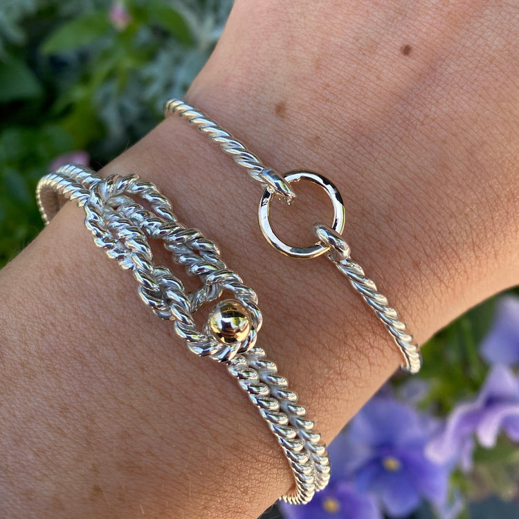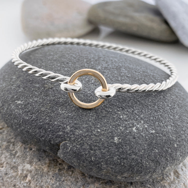 A beautiful compliment to the Cape Cod Jewelry collection, this is a twisted sterling silver bracelet with solid 14k gold center ring.