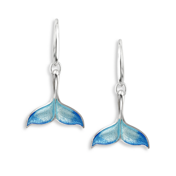 Blue Whale Tail Wire Earrings in Sterling Silver with Vitreous Enamel. Rhodium Plated for easy care.