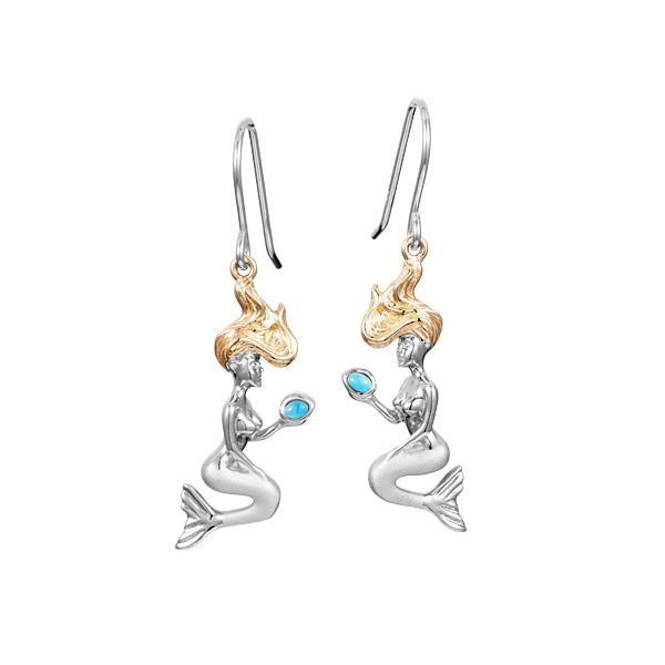 This two tone mermaids are crafted in sterling silver and features 14k gold flowing hair. The mermaids have a matte finish tail and are holding a larimar gemstone.