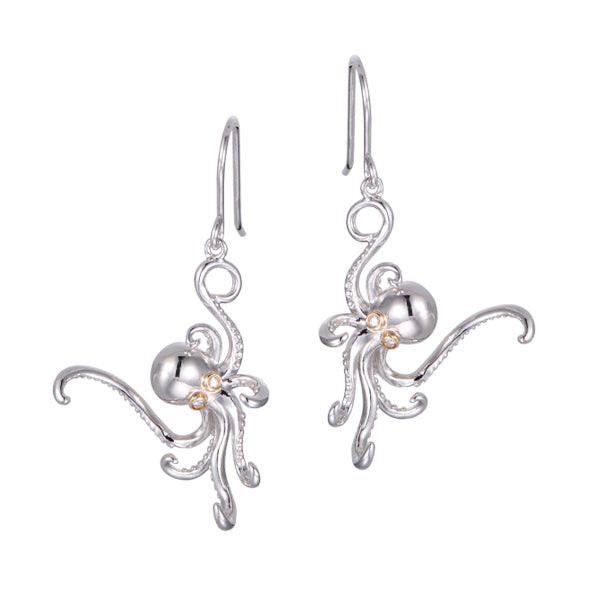 A playful pair of two tone octopi earrings set in sterling silver with gold accents is fun and reminiscent of the summer! The pair has accents of round diamond eyes!