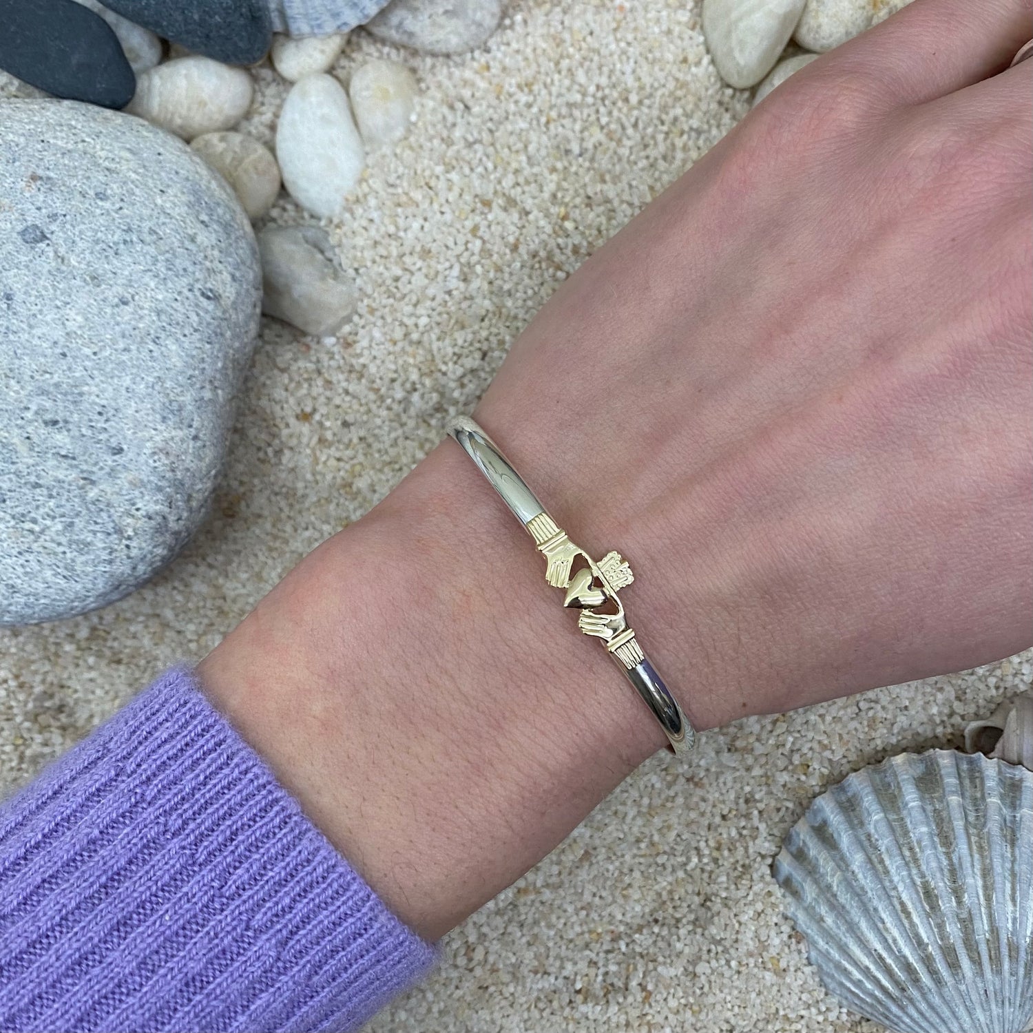Available in two tone - solid 14K gold and sterling silver or all sterling silver. The bracelet has a hidden hook underneath the Claddagh.