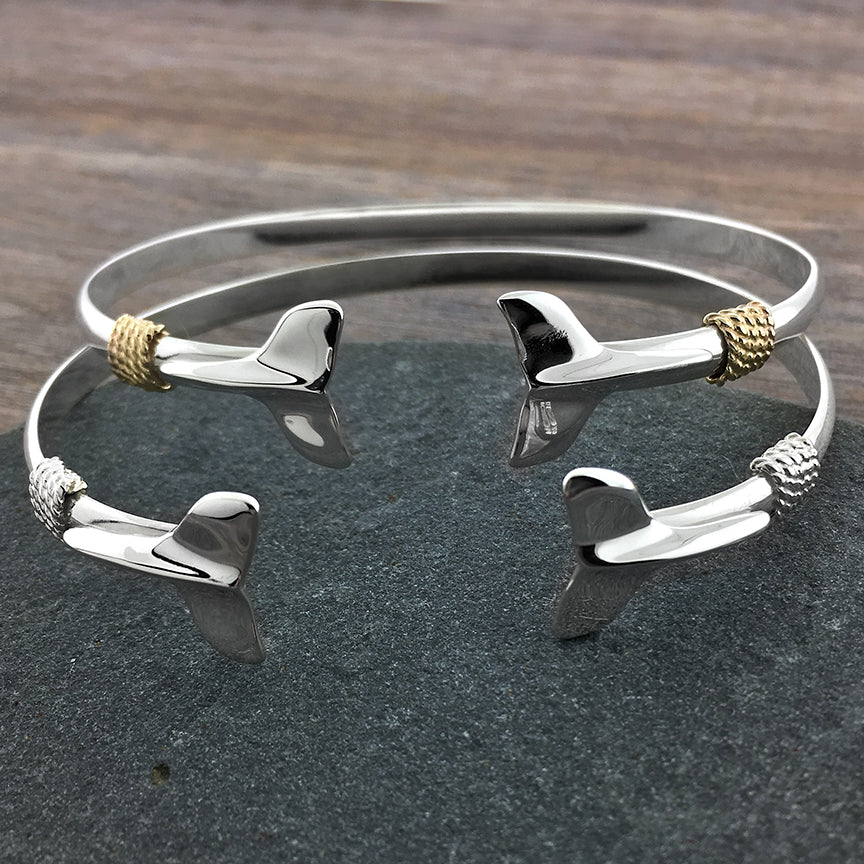 This sterling silver whale tail cuff features nautical rope wrap on each side - choose from 14k gold nautical rope or all sterling silver.