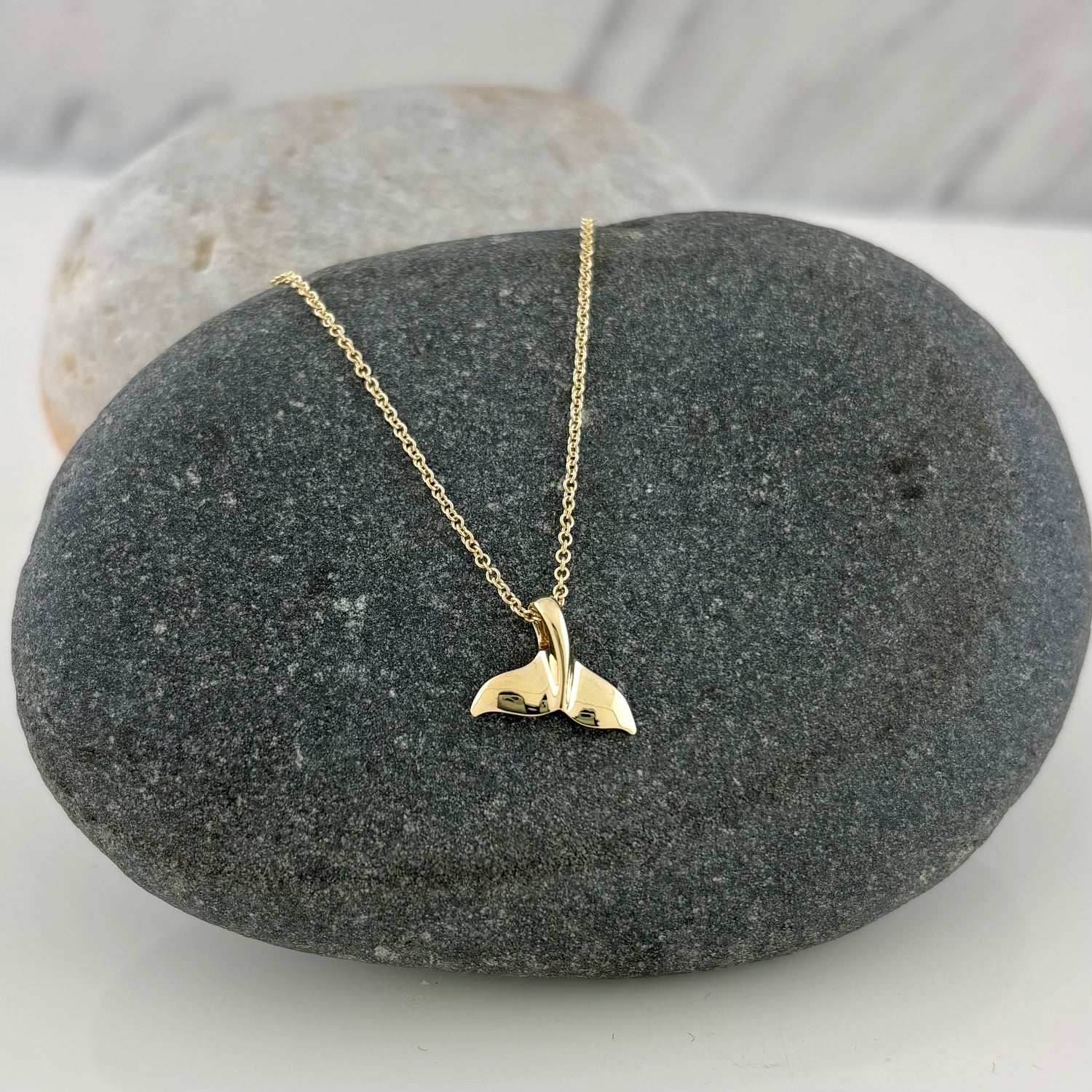 This necklace is crafted in 14K gold and features a polished whale tail pendant on an adjustable 16-17" 14K gold cable chain with spring ring clasp.