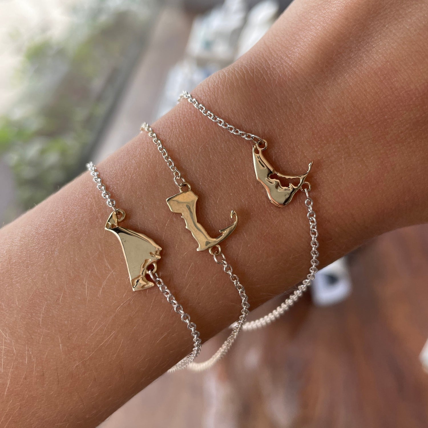 Capeology's Nantucket Map Bracelet lets you wear this special place wherever you go. This piece is made out of sterling silver. The chain is adjustable and has the option to be worn at 7.0, 7.5, or 8.0 inches in length. The back of the bracelet is engraved with "CAPEOLOGY."