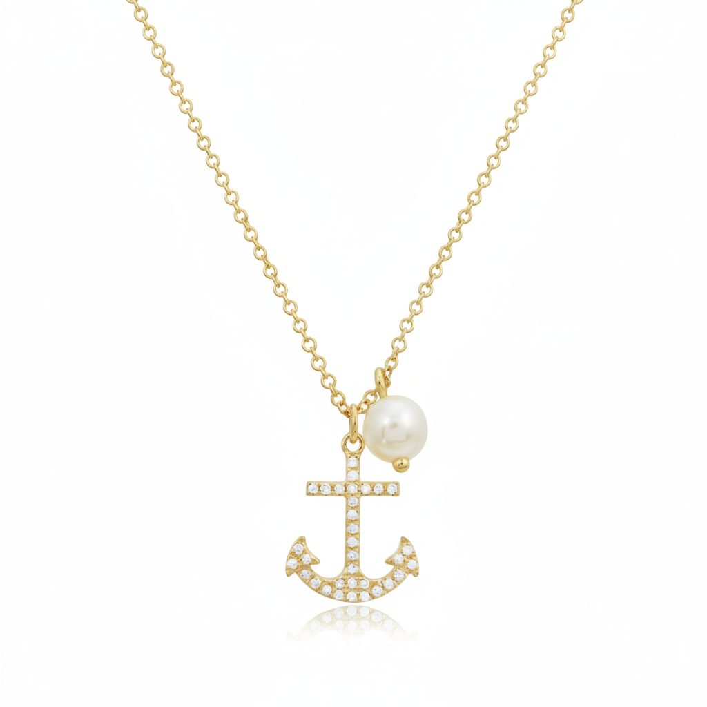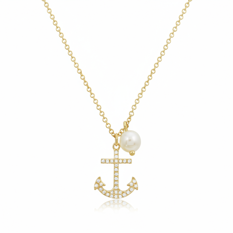 This nautical charm necklace features a 14K yellow gold anchor adorned with diamonds and a 5mm fresh water pearl clustered together on an adjustable 14K gold cable chain. Necklace is adjustable between 16-18"