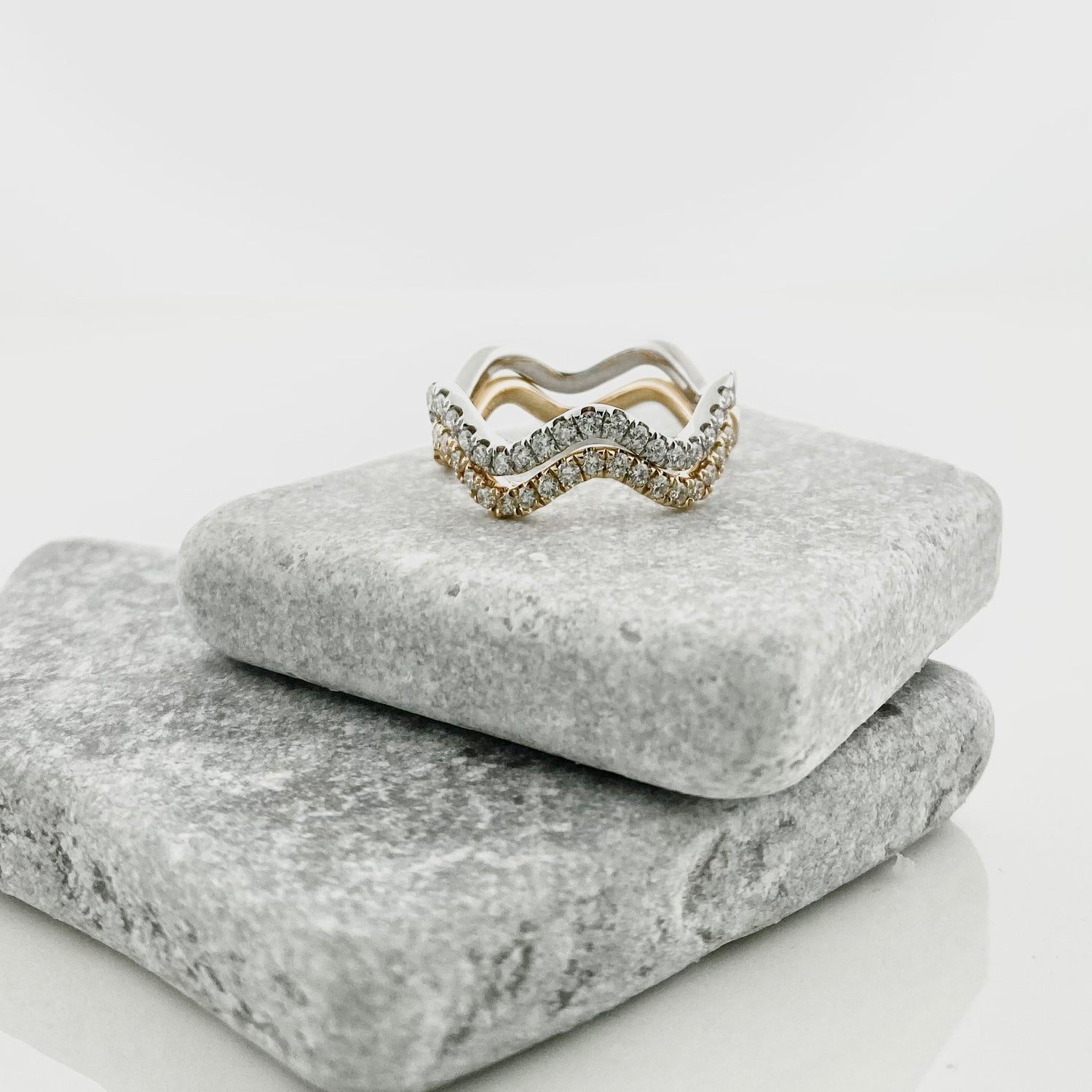 This 14k gold and diamond wave ring makes a beautiful statement alone, or paired with your own ring. It has 27 round brilliant cut diamonds for a total weight of 0.27 CT.