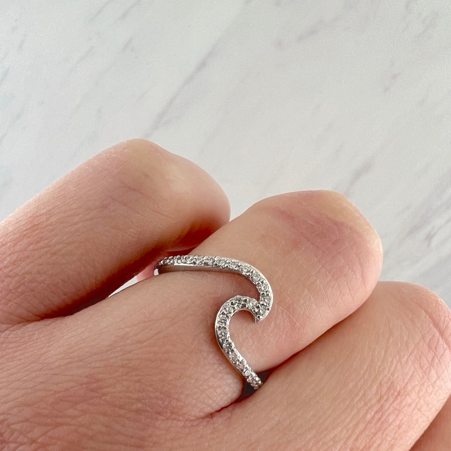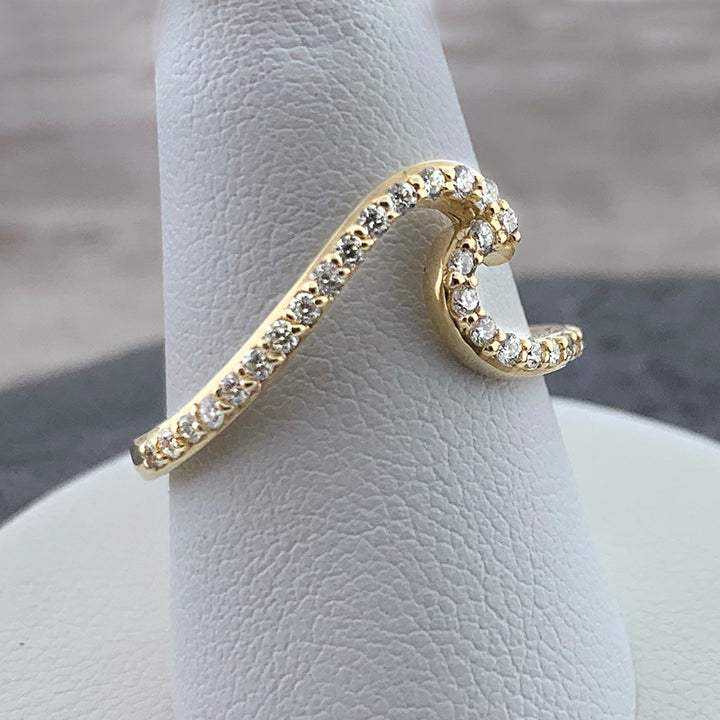 This wave ring makes a simple yet elegant statement. Made from 14k gold with 30 brilliant round diamonds weighing a total of 30 points. Available in 14k yellow or white gold!
