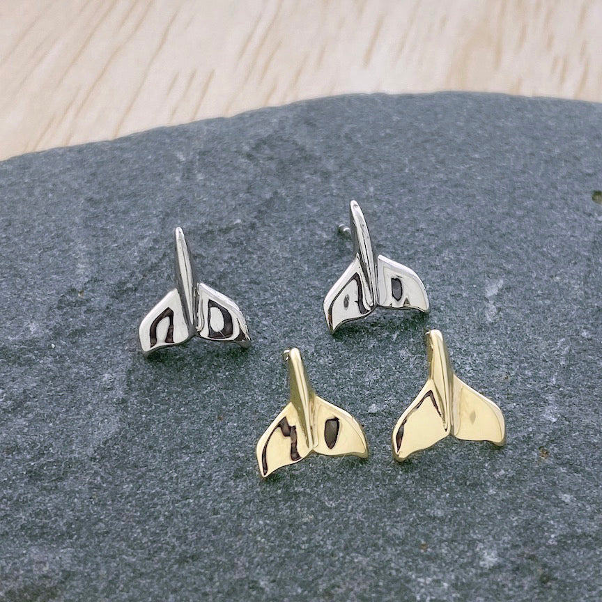 Beautifully detailed whale tail stud earrings available in sterling silver or solid 14k gold. The earrings measure approximately 1/4".