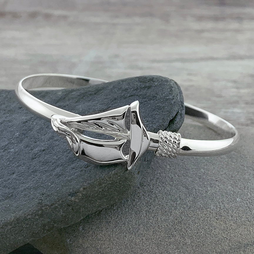Lovers of the sea and boating enthusiasts will love this sleek sailboat bracelet. Made from sterling silver, it has a shiny finish with nice detail.